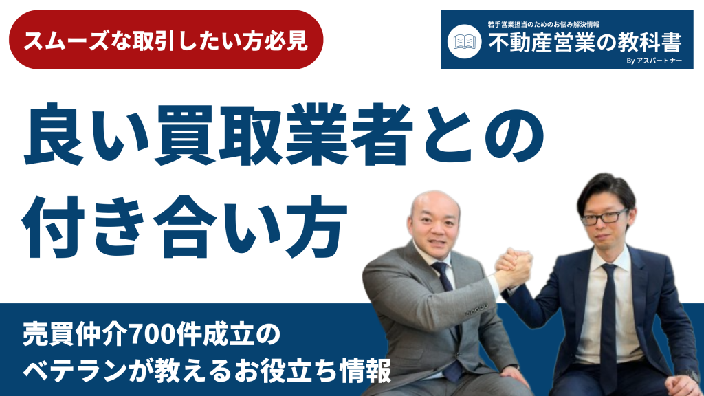 こんにちは。不動産営業の教科書です。 このメディアでは、不動産営業担当の方々のお悩みを解決する情報をお届けしています。 私、井口はこれまで700件以上の仲介売買成約の経験をさせていただき、株式会社アスパートナーという不動 … 続きを読む 【不動産】営業担当必見!信頼できる買取業者の見極め方とは?